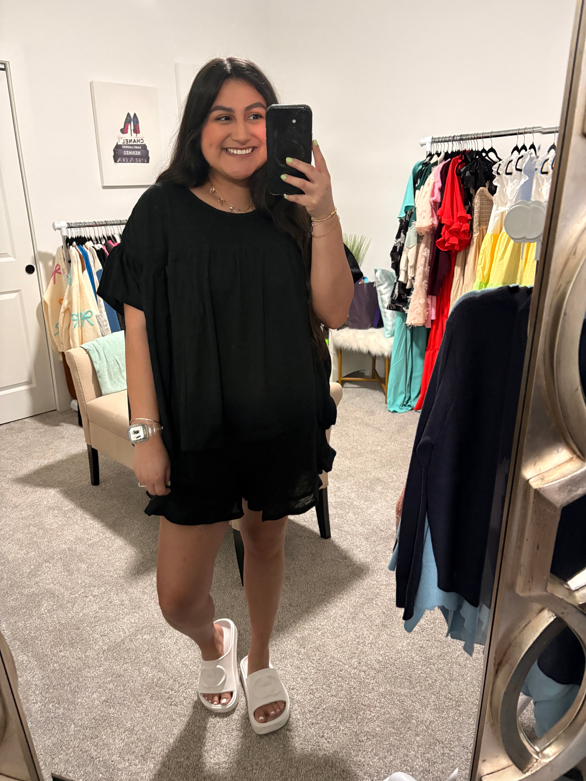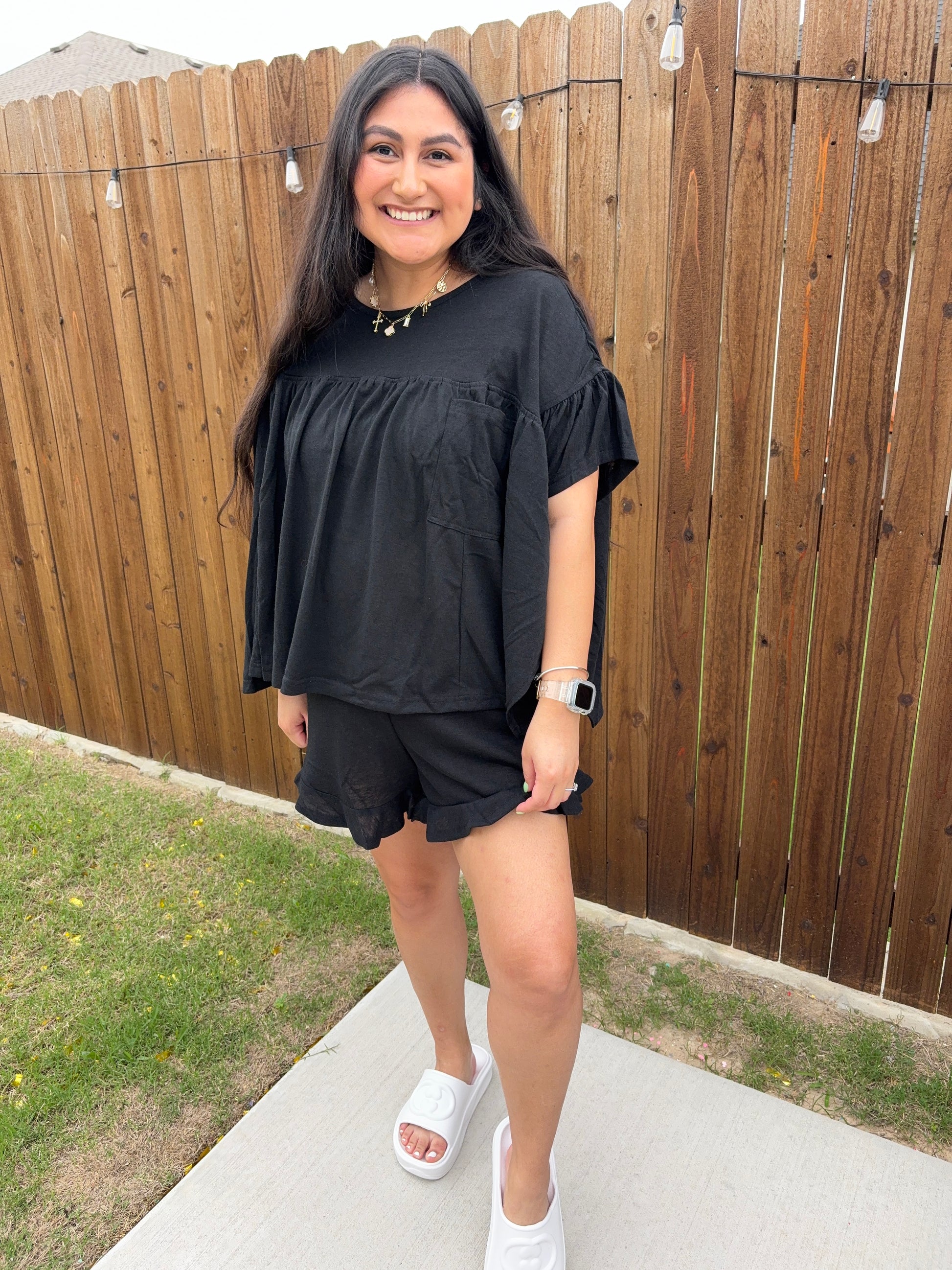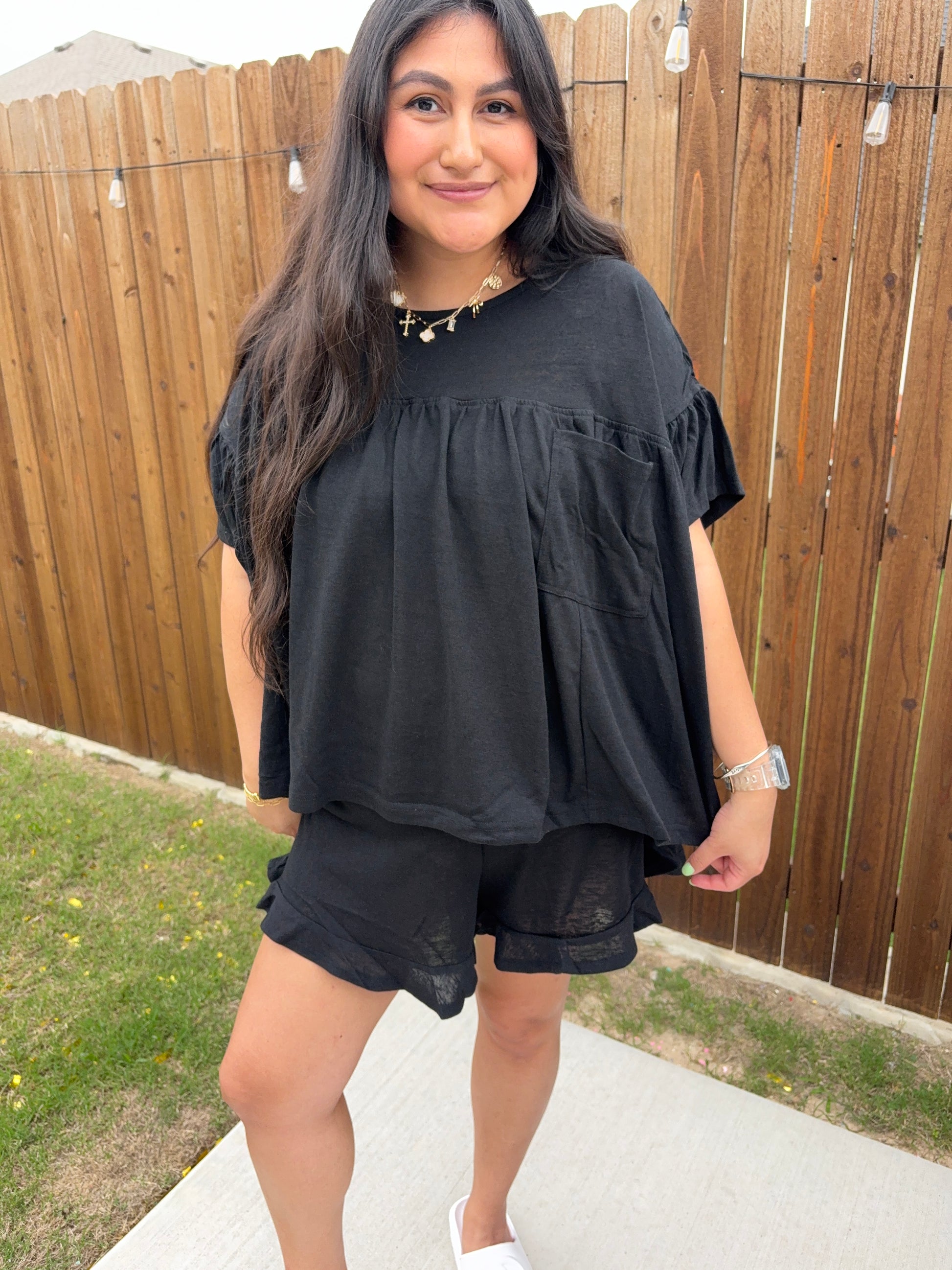 You'll Want To Wear This Matching Set Everyday Because Of How Breezy It Is. Crafted From Slub Cotton, The Top Has Short Sleeves With A Babydoll Style Silhouette. The Matching Shorts Are Super Flowy And Have A Ruffled Trim.