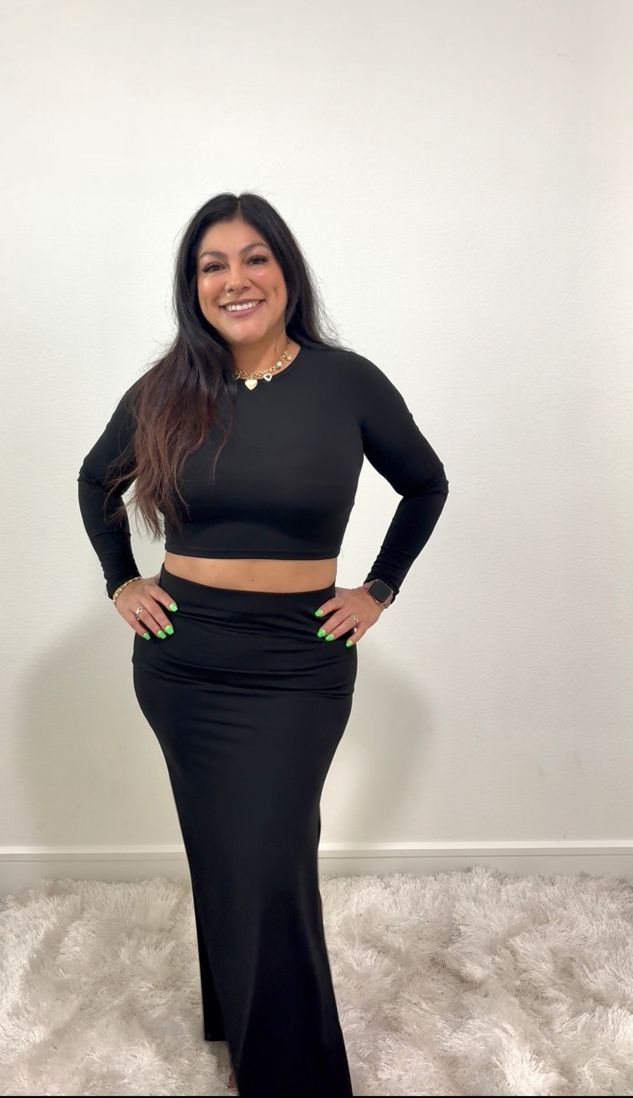 This Stylish Two-Piece Set Features A Long Sleeve Crop Top And A High Slit Maxi Skirt, Perfect For Any Occasion. The Crop Top Is Designed With A Fitted Silhouette And A Classic Crew Neckline, Ensuring Both Comfort And Style. The High Slit Maxi Skirt Complements The Top, Offering A Touch Of Elegance And A Hint Of Sultry Appeal. Made From A Soft, Stretchy Fabric, This Set Provides A Flattering Fit That Moves With You. Wear Together For A Coordinated Look Or Mix And Match With Other Pieces In Your Wardrobe. Ideal For Day Or Night, This Set Is A Must-Have Addition To Your Fashion Collection.
